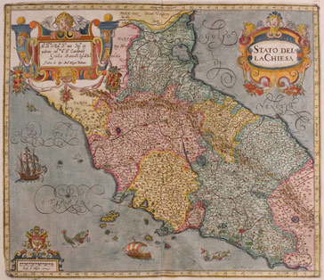 Gonzaga also assisted Magini with his atlas project and allowed for cartographic material of the various states of Italy to be brought to him. Magini finally dedicated the atlas to Gonzaga and his map of the duchy of Monferrato to Caterina Medici Gonzaga. He generally dedicated many of his maps to rulers, aristocrates, and ecclesiastics. Thus he dedicated the map of Bologna to Cardinal Sforza.