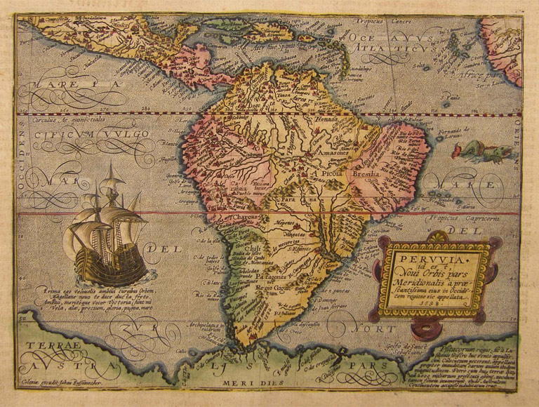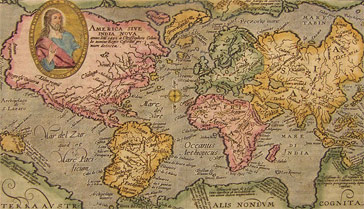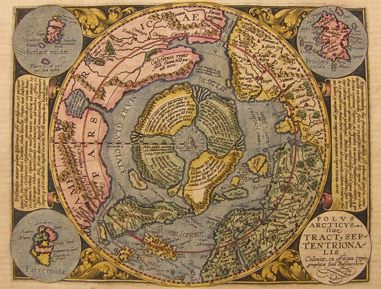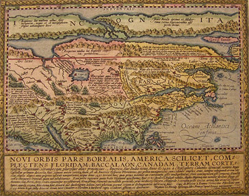 The probably most outstanding map of the ones presented here is Novi Orbis Pars Borealis, one of the first maps showing North America separately. The unusual depiction was derived from the respective map by Gerard de Jode.