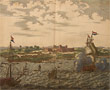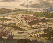 The graphics offered here include 1 panorama view (about 55 x 31 cm), 7 views in double-page size (about 37 x 31 cm) as well as 6 maps in double-page size (about 37 x 31 cm), all of them showing towns or areas in America, as the work out of which the graphics are coming is dealing with history and regional studies of the New World.