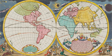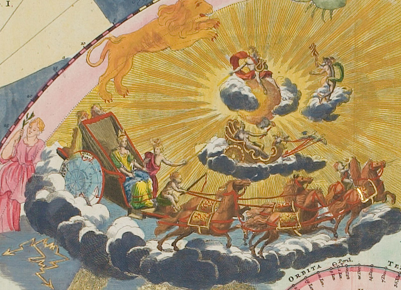 The Atlas contains depictions of the solar system, the planet movements, constellations, a lunar map and a world map. Most of the images are framed by beautiful allegoric figures.